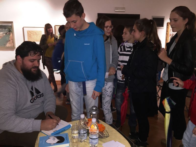 V ponedeljek, 19. 10. 2015, nas je na grad Velenje pripeljalo 233 stopnic. Ko smo prišli na grad, smo šli v sobo, kjer smo spoznali Boštjana Gorenca Pižamo. Ta dogodek so tudi snemali (VTV). Ugotovili smo, da je eden od slovenskih prevajalcev knjig, med drugim je prevedel Kapitana Gatnika, Krive so zvezde, Čudo ... Knjigo Krive so zvezde vam zelo priporočava. Beseda je tekla o prevajanju in za prevod knjige je potrebno najmanj 2 meseca, nato gre knjiga v branje lektorju in uredniku in šele nato v tisk. Povedal je tudi, da se kot prevajalec z avtorjem, čigar knjigo prevaja, ne sreča v živo. Pižama je včasih prevajal knjige le ponoči, ker čez dan ni imel časa. Zdaj, ko živi družinsko življenje, pa prevaja knjige tkarta, ko je njegov sin v vrtcu. Po pogovoru smo se s Pižamo fotografirali, dobili avtograme ter se malo posladkali s piškoti in sokom.