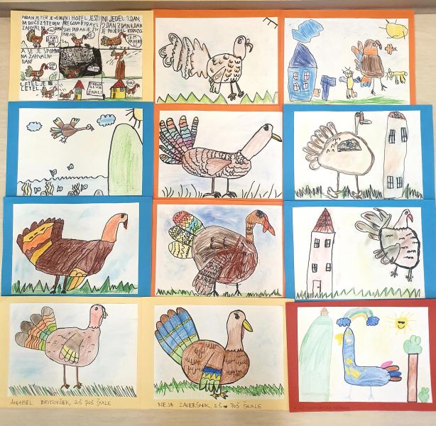 Odzvali smo se povabilu šole CVIU in si prebrali zgodbico o puranu, ki je ugotovil, da suh puran je živ puran. Zgodbo je napisala njihova učenka. Res zanimivo. Nato so učenci narisali svoje domišljijske purane. Slike smo poslali na njihovo šolo in bodo razstavljene v galeriji Mozirje.